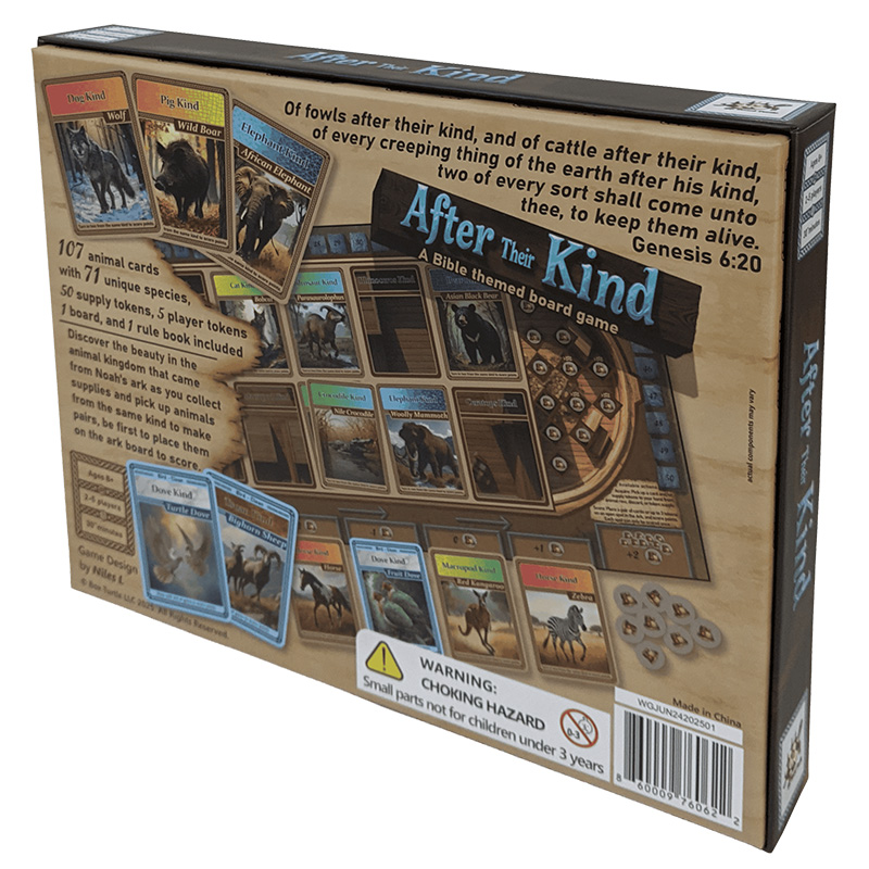 Explore the beauty and diversity of the animal kingdom in this Noah’s ark–themed board game! After Their Kind features a 24" x 10" game board and strikingly illustrated animal cards representing a large number of species. Designed for families and friends, this game shows the beauty and diversity of the animal kingdom while reinforcing the concept of created kinds.