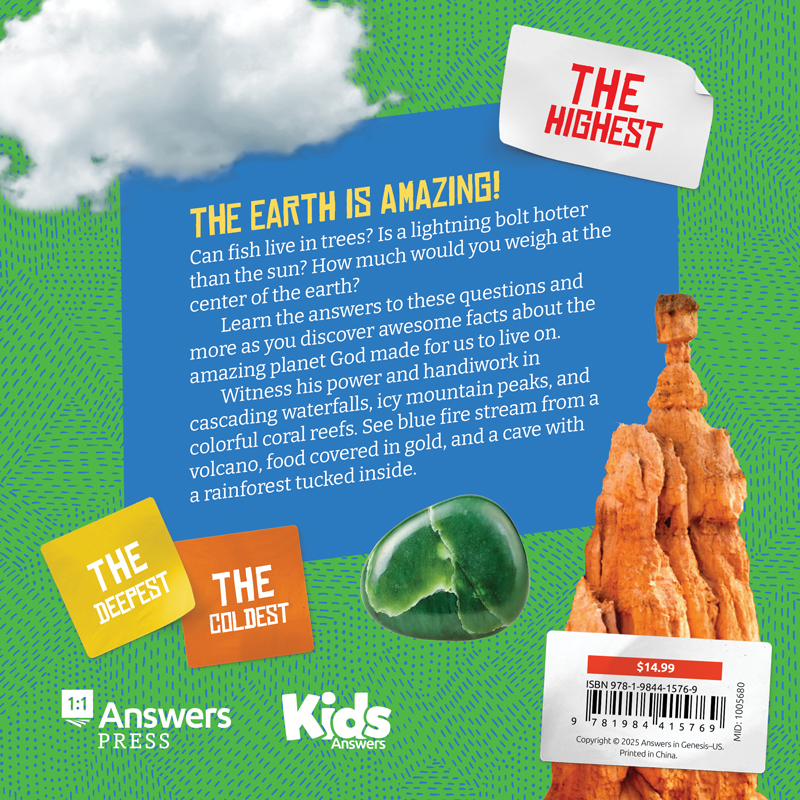 Discovering cool facts about God’s world is an adventure! From the tallest mountains to the deepest oceans and from cascading waterfalls to colorful reefs, there’s so much to learn about our special planet. With informative text and gorgeous photos, this book examines what makes earth perfectly suited for life, including our atmosphere, fresh water, and plants for food. Discover amazing facts about volcanoes, caves, waterfalls, and storms while learning how the earth shows the true history of the global flood.