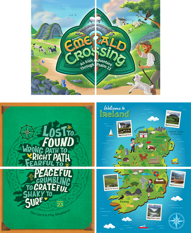 Features Emerald Crossing logo (2 panels), map of the Emerald Isle (2 panels), and Crossings art (2 panels). Set of 6 panels. Each panel is approximately 42.3 x 62.6 in. (1074 x 1590 mm). Shipped in rolls. Not returnable.