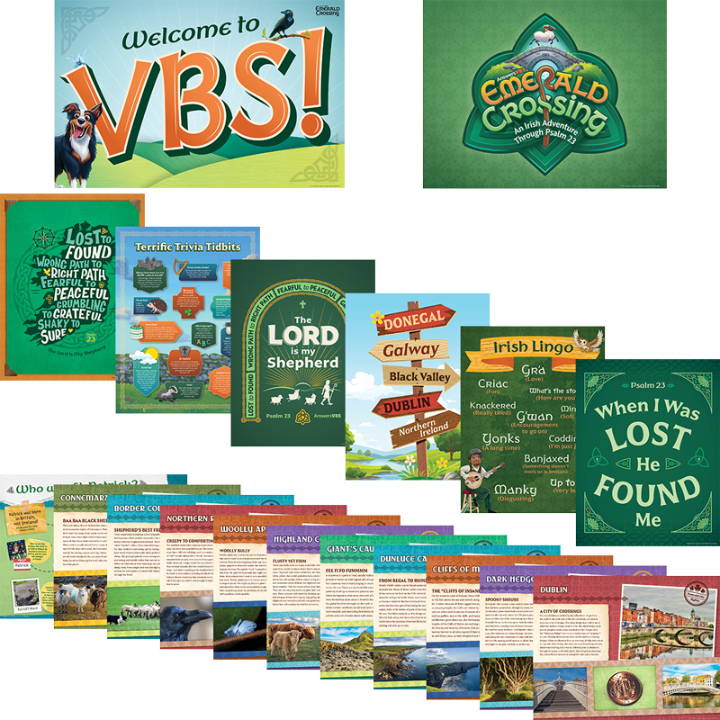 These colorful and informative posters give your VBS spaces Irish flair. Includes Emerald Crossing logo (1), welcome poster (2), animals (5), crossings (3), trivia (1), directions (1), St. Patrick (1), Irish lingo (1), and Emerald Isle sights (5). 17 x 22 in. Only sold as a set of 20. Ships folded once.