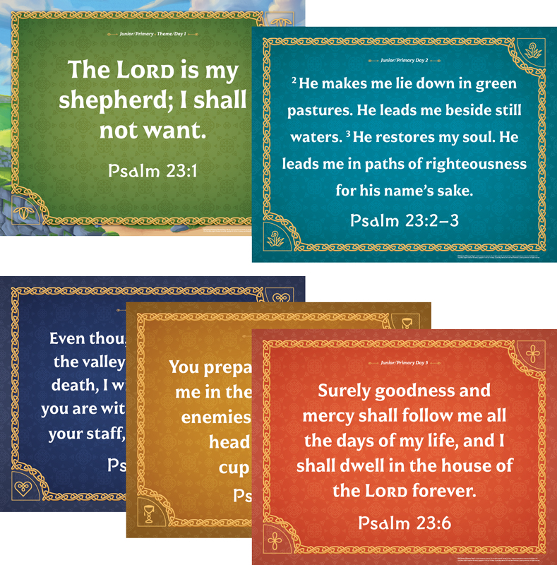 Memory verse posters to display for each day. Two-sided (ESV on one side and KJV on the other). 22 x 17 inches. Only sold as set of 5 per age group. Ages 6–12.