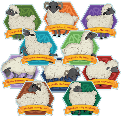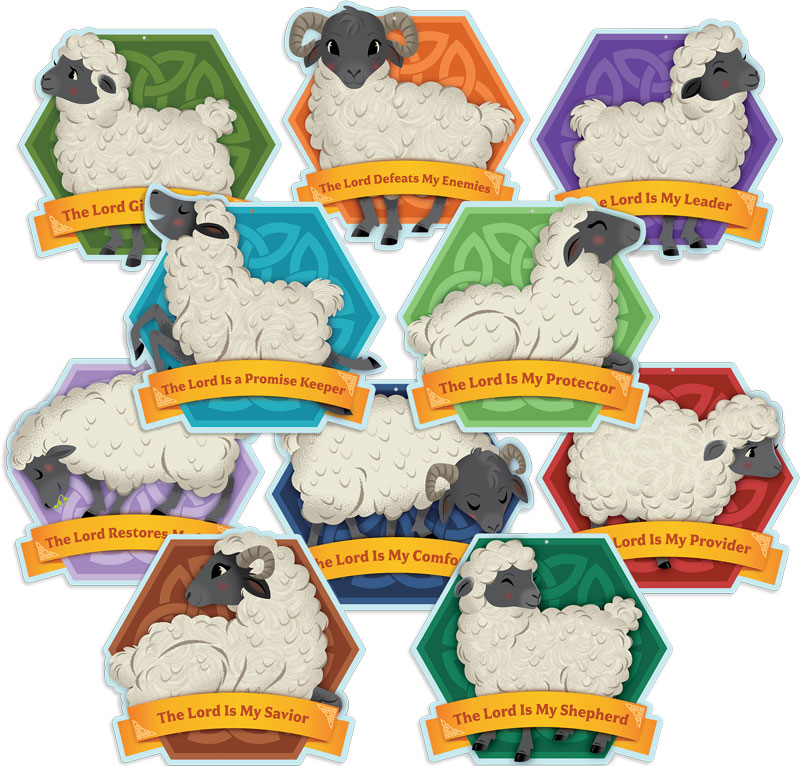 Easily decorate your walls or ceilings with these rugged banners featuring reminders from Psalm 23 of who the Lord is. Comes with a die-cut hole at the top for easy hanging. Printed on both sides. 14 1/5 x 14 3/4. Set o 10.