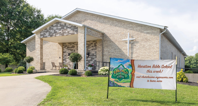 Announce your VBS to everyone who drives by your church with this huge, waterproof, vinyl banner! Includes steel grommets and reinforced stitched borders to make hanging easy. Name section arrives blank. Write in your information using a permanent marker or with vinyl letters. 96 x 42.75 inches