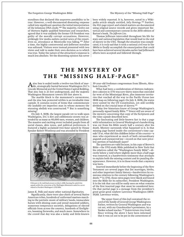 How many public-school history teachers have taught their students the fact that Washington used his final will to soon free every enslaved person he legally could? Or that he was the first recorded subscriber to a massive study Bible with an incredibly patriotic illustration that ties Scripture directly to the U.S. Constitution? Or that a page from President Washington’s own copy of that Bible was given by the Washington family to a “Yankee schoolteacher” so it could be buried in the cornerstone of the Washington Monument, 21 feet beneath that towering memorial. A silent witness to the faith that shaped our nation.