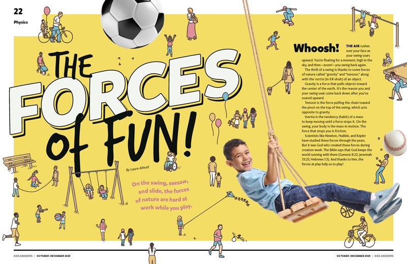 On the swing, seesaw, and slide, the forces of nature are hard at work while you play. And thanks to God, the forces at play help us to play! Learn more in this issue of Kids Answers.