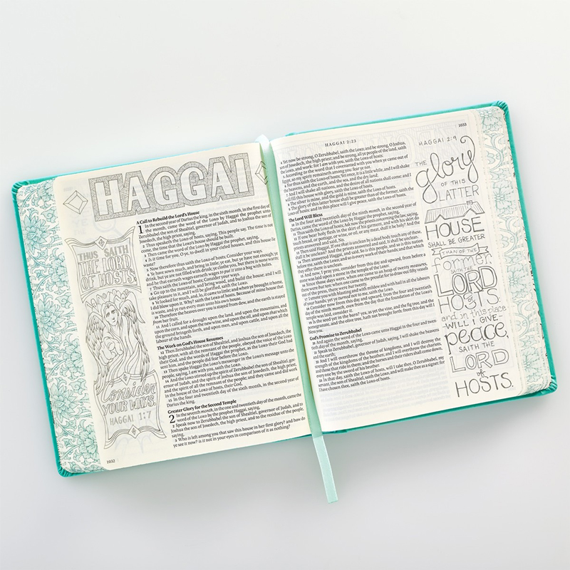 This edition uses a standard 8.65-point font and is set in a single-column format with two-inch-wide ruled margins for note-taking, scribbling your reflections, or creatively expressing your insights. Nearly 400 hand-drawn line-art illustrations are placed throughout the single-color Bible to serve as visual tools for meditating and reflecting on Scripture.