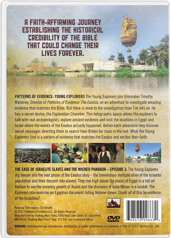 The Young Explorers join filmmaker Timothy Mahoney, Director of Patterns of Evidence: The Exodus, on an adventure to investigate amazing evidence that matches the Bible. But there is more to the investigation than Tim lets on. He has a secret device, the Exploration Chamber. This holographic space allows the explorers to talk with real archaeologists, explore ancient evidence and visit the locations in Egypt and Israel where the events of the Exodus actually happened. Before each adventure they discover secret messages directing them to search their Bibles for clues in the text. What the Young Explorers find is a pattern of evidence that matches the Exodus and excites their faith.